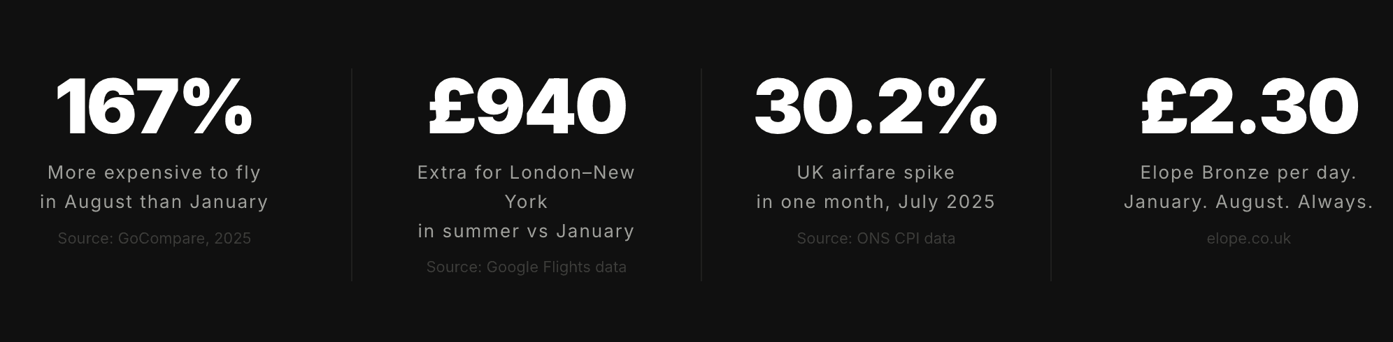 The Santorini number is particularly telling. A British Airways return to Santorini costs £217 in November and £381 in August — verified by MoneySavingExpert. Two people travelling peak season vs off-peak pay £328 more. For the identical flight.